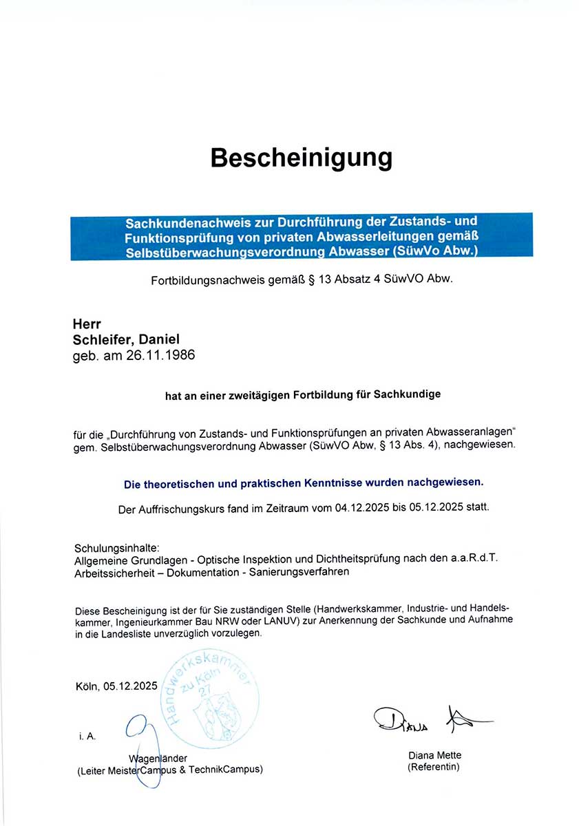 Die Firma Schleifer Rohr- und Abawassertechnik hat die Sachkunde für Dichtheitsprüfungen an privaten Abwasserleitungen nach § 61a Landeswasser-Gesetz NRW nachgewiesen!Durch Anklicken können die Zertifikate vergößert werden.